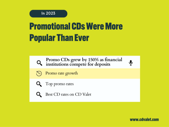 In 2023, the number of promo CDs (CDs outside of the standard 12-, 24-, 36-, 48-, and 60-month terms) available on CD Valet grew by 150%. While standard rates (rates with 12-, 24-, 36-, 48-, and 60-month terms) saw a 35% growth in available rates.