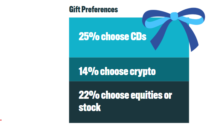 Based on a survey conducted by YouGov, 25% of participants highlighted Certificates of Deposit (CDs) as a preferred investment gift.